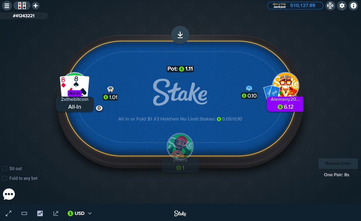 All-In or Fold is the newest, fast-paced format added to Stake Poker. It’s played just like standard Texas Hold’em — every player receives two hole cards, and the small and big blinds are posted as usual. The only twist is that there’s no call or check option. You either go all-in or fold. That’s it. You’re either risking your entire stack or sitting the hand out.
