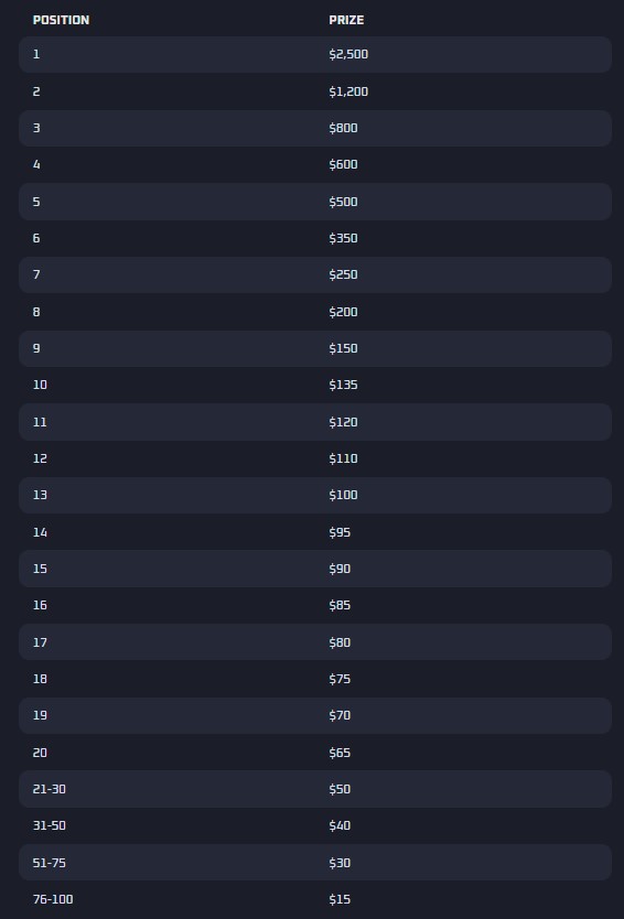 The $10,000 prize pool is distributed among the top 100 players based on their final leaderboard position. The highest-ranked player receives $2,500, while the lowest qualifying prizes start at $15.