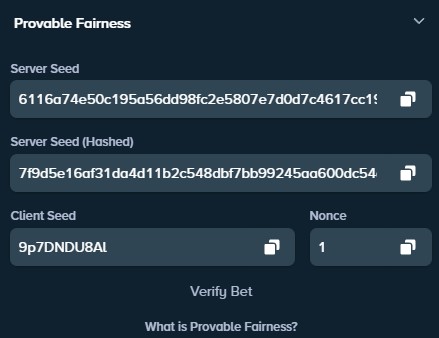• The server seed is revealed only after you manually rotate your seeds. Until then, the casino displays only a hashed version, which serves as a commitment but cannot be used to verify results. The hashed server seed alone is not sufficient to reproduce game outcomes. Full verification requires the unhashed server seed revealed after rotation.