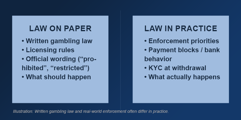 When it comes to crypto gambling, written law is only part of the picture. For players, practical risk is usually shaped by payments, enforcement behavior, and taxation — not by whether a law technically allows or bans crypto gambling.